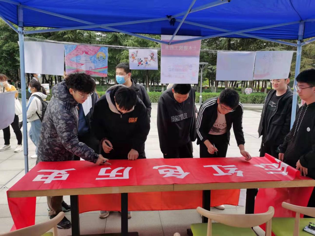 活动共征集作品65幅,筛选出符合主题作品40幅,并于10月18日完成评选,产生一等奖三名,二等奖三名,三等奖三名以及优秀作品参与本次外展活动。活动吸引了学校老师和同学驻足观看,他们纷纷表达了对本次外展活动的肯定和赞扬。活动最后,伴随着我系学生有序在宣传横幅上签名,本次“升温十四运,绘梦我的城”活动在下午六点圆满结束。本次活动,学生以落实“为人民服务”的伟大精神与“奉献、友爱、互助、进步”的志愿服务精神为出发点,将十四运的志愿服务精神和美丽西安结合起来,以绘画的方式助力十四运,助力西安,充分展现了土建学子的青春风采。