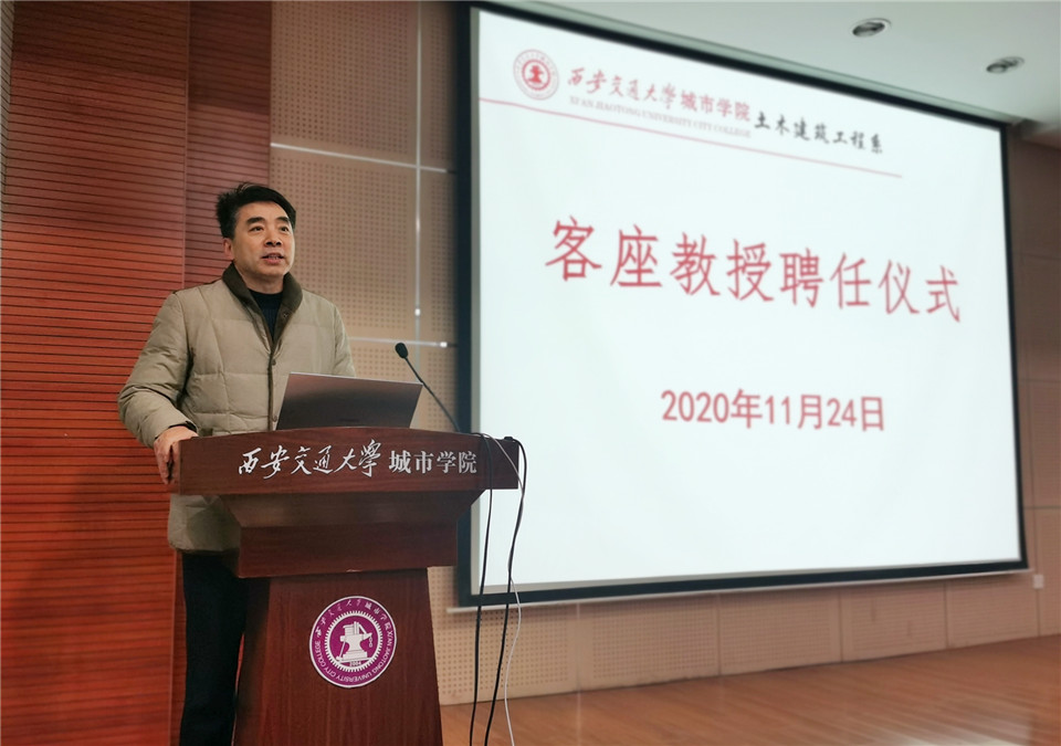 随后,学院副院长朱旭教授亲自为谢永利教授颁发了聘书,聘请谢教授为beat365亚洲版官方网站客座教授。聘任仪式后,朱院长发表了热情洋溢的讲话,他对谢教授到校进行学术讲座活动表示热烈的欢迎,对谢教授支持城市学院的教学工作和学生培养表示衷心的感谢。朱院长充分肯定了土建系的专业学科建设和思想人文建设工作,为在座的师生描绘了土建系良好的专业前景,鼓励大家继续齐心协力,充分利用好当前优良的教学资源和专业优势,加强基础理论和专业理论学习,牢固根基,并通过“建筑之声”等素质教育平台,开拓视野,学习专家、大师身上所具有的刻苦钻研、敬业奉献精神,树立鸿鹄之志,争做一名全面发展的社会主义建设者和接班人。