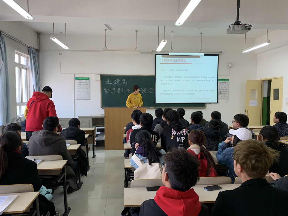 本学期前三周,土建系组织各年级以班级为单位,举行了新学期主题班会,班会以总结和展望为主题,重点制定了本学期班集体建设目标和学风建设的各项措施,班会由班主任和辅导员组织。在主题班会上,各班级总结了上学期班级成员和集体在学业与各项活动取得的成绩和不足,将警示和鼓励相结合,重点分析学生在学习中存在的问题及解决措施,并对本学期的学业规划、创新创业、宿舍文化建设等重点工作进行了安排。