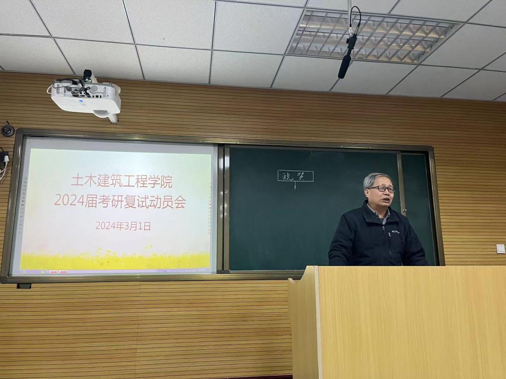 为助力土木建筑工程学院2024届考研考生顺利通过研究生复试,31日上午,土建学院在B407教室举办2024届考研复试动员会。副院长黎莹、校督导专家凌伟、学院教工党支部书记郭秀琴、建环专业负责人白梦梦、毕业班辅导员张庆莹、文都考研复试辅导名师王钰、2024届全体考研上线同学参加会议。动员会由学工负责人李辉主持。