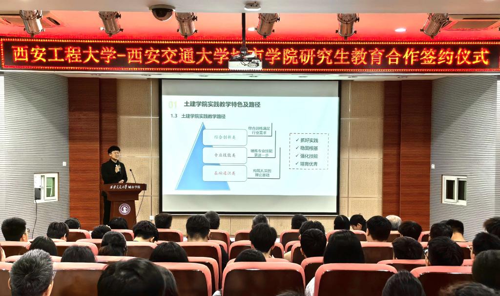 签约仪式后,学校土建学院实验中心负责人戴世安从土建学院实践教学特色、实验中心组成及实践能力培养模式等方面汇报了beat365学生培养情况。西安工程大学强天伟教授和刘洋教授分别对建筑环境与能源应用工程、土木工程两个专业的基本情况和发展前景进行了宣讲,并鼓励学生积极报考西安工程大学。