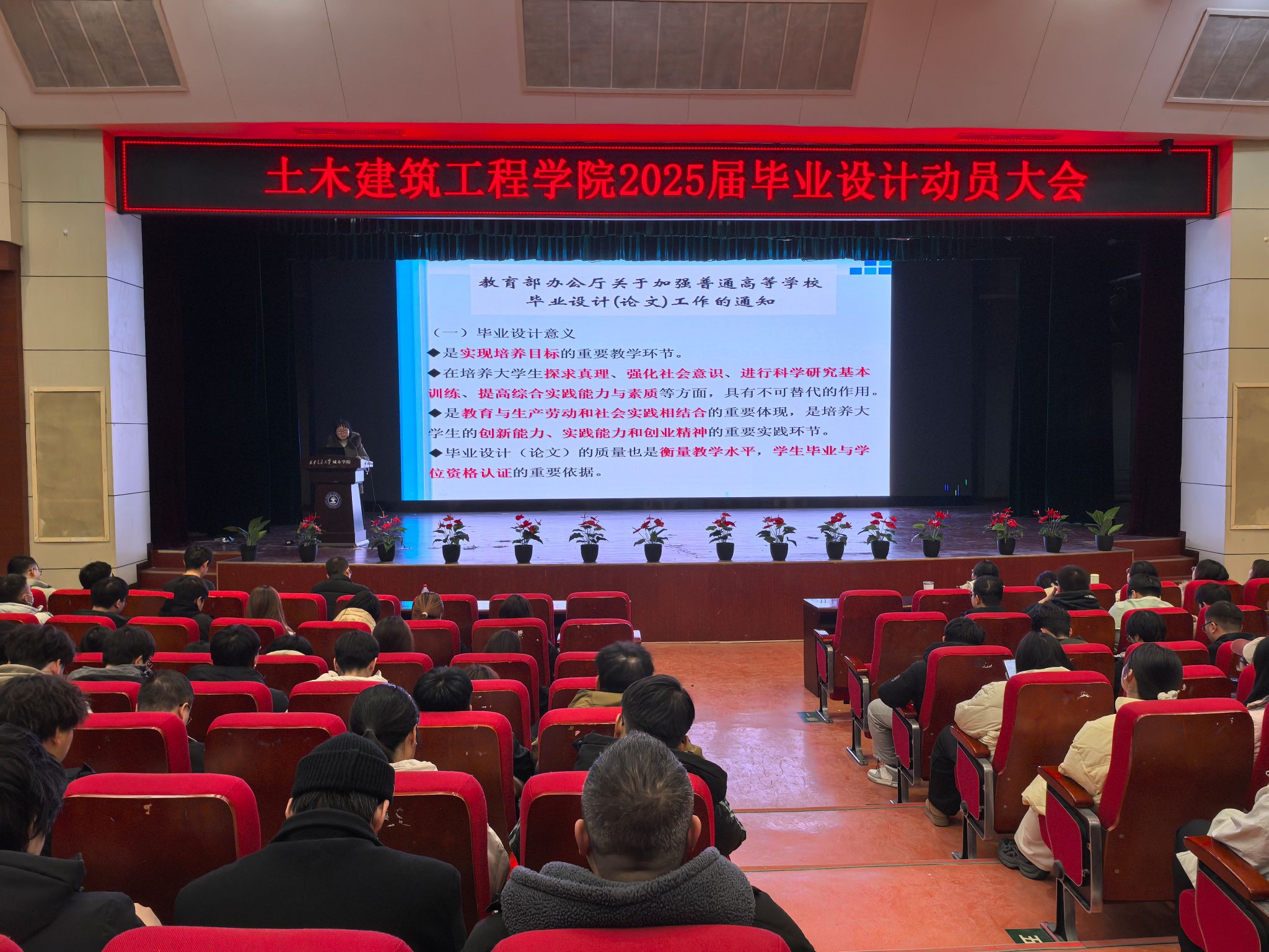2024年12月23日下午,土木建筑工程学院在教二报告厅召开了2025届毕业设计(论文)动员大会。土建学院全体指导教师、辅导员老师及2025届毕业生参加会议,会议由土建学院副院长黎莹主持。