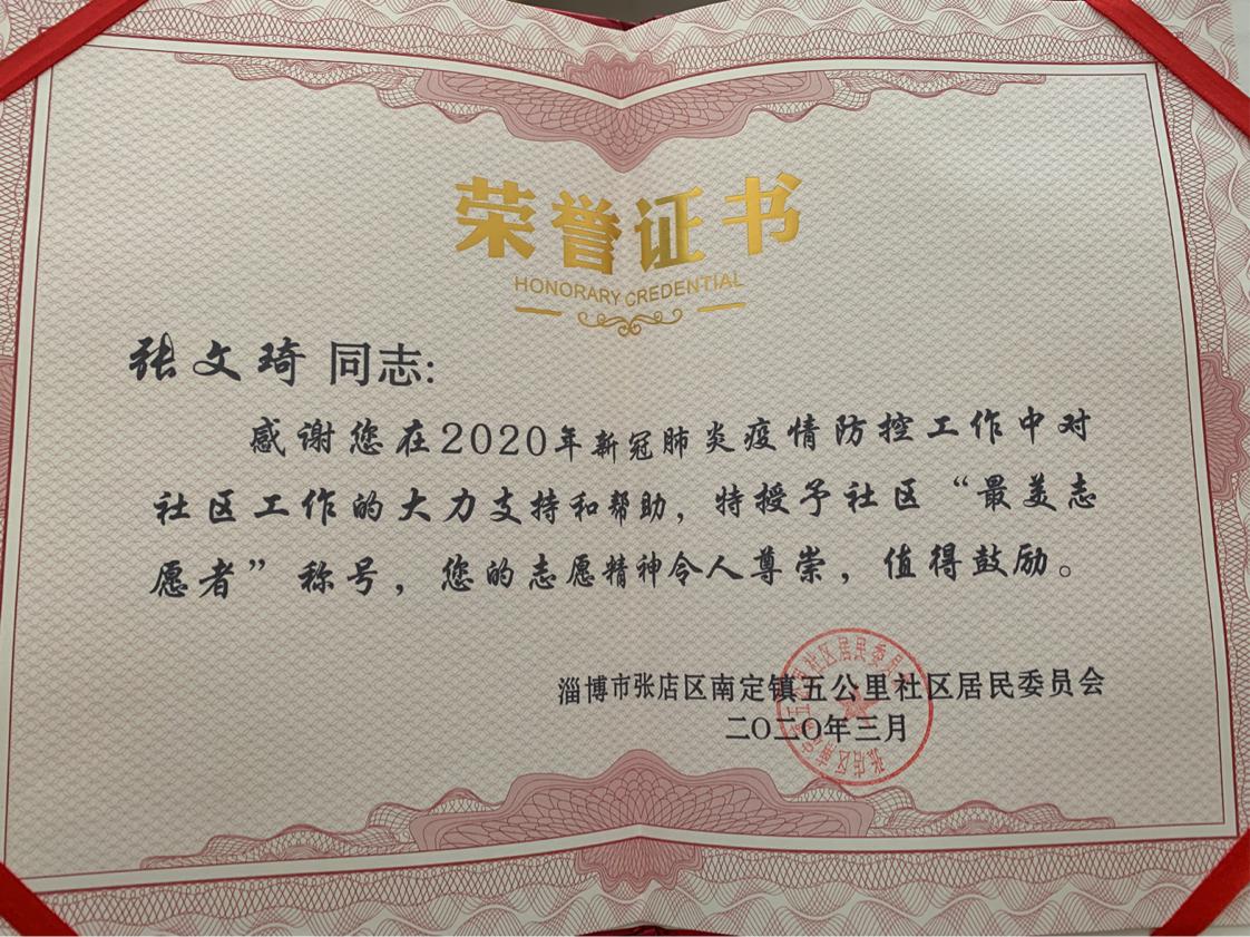 春节前,张文琦同学像往年一样,伴随着新年的临近,在家打扫卫生,布置年货。只是今年的春节,被一场疫情搞得人心惶惶,疫情的突然爆发,范围之广,让所有人都始料未及。随着疫情的逐步扩大,全国各地开始封城封路,社区进出也严格管制。眼看着形势愈发严重,张文琦同学意识到要为社区人民做些什么。在看到公众号平台宣传的招募志愿者的活动后,他在第一时间报上了名。作为一名学生党员,他深知关键时刻更要挺身而出,牢记党员使命和担当。之后的有一段时间连续阴雨天气,寒气直往骨子里钻。复工之后上下班车辆很多,出入的人员又多又杂。张文琦和志愿者们只能冒着雨工作。还有好心人和单位捐了帐篷、水、方便面等物资,他说之前都是在网上看到这种事例,真正自己遇到了送物资的事,心里又感动又熨帖。“大家团结一心,有爱有情,疫情一定会被战胜。”从2月3日到3月2日,整整一个月张文琦都在社区做防疫工作,不计酬劳,不辞辛苦。他仍然觉得:没有什么了不起的,他只是全国千万个志愿者当中最普通的一个,很高兴能为这次战“疫”贡献微薄之力,相信大家手挽手,共筑防疫长城,等待春回大地,共赏樱花烂漫。
