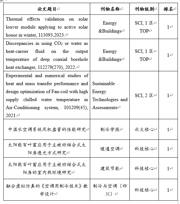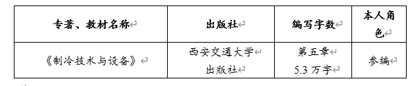 主要讲授《空调用制冷技术》、《空气调节工程》、《专业软件应用》课程,指导生产实习、毕业设计、课程面向的课程设计、课程实验,指导学生参加学科竞赛和创新创业等实践活动。指导学生实践及学科竞赛获得全国一等奖、二等奖、优秀奖共计3次。主持完成各级教学改革项目4项、各级科研项目2项;发表SCI(2区及以上)和核心论文7篇;获得实用新型专利3项。
